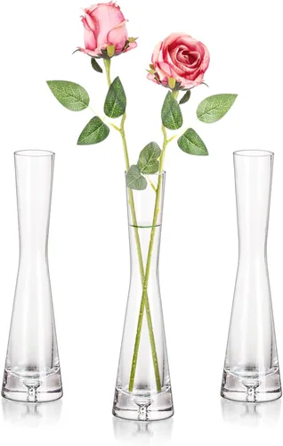 JARRONES ESTABLES HECHOS A MANO – Estos jarrones de vidrio para flores están hechos de vidrio de cristal grueso reciclado a través de un proceso de soplado a mano. Con un diseño minimalista, forma de cintura delgada y base estable y pesada, estos jarrones altos y delgados iluminarán tu hogar con un toque de calidez. Moderno y elegante: los jarrones transparentes simples, modernos y elegantes hacen que el arreglo floral sea divertido y fácil. El jarrón para una sola flor es ideal para una flor de tallo corto o dos flores pequeñas. Se ven muy bien agrupados y elegantes. USO EN MÚLTIPLES OCASIONES -- Los pequeños jarrones de vidrio hechos a mano para centros de mesa son un gran regalo para bodas, Navidad, Acción de Gracias, inauguración de casa, vacaciones, Día de la Madre, cumpleaños y aniversario. Hermosa decoración para escritorios, estanterías, mesas, alféizares de ventanas, encimeras, cocina, comedor, sala de estar, oficina y mucho más. PAQUETE RESISTENTE -- Todos los floreros pequeños a granel están envueltos en espuma gruesa y empaquetados en una caja resistente para garantizar que se entreguen en las mejores condiciones. Garantía de satisfacción completa: el paquete incluye 3 jarrones de flores transparentes. Comuníquese con nuestro servicio de atención al cliente si recibe un jarrón roto o no está satisfecho con ellos. Te reembolsaremos inmediatamente o te reemplazaremos.
