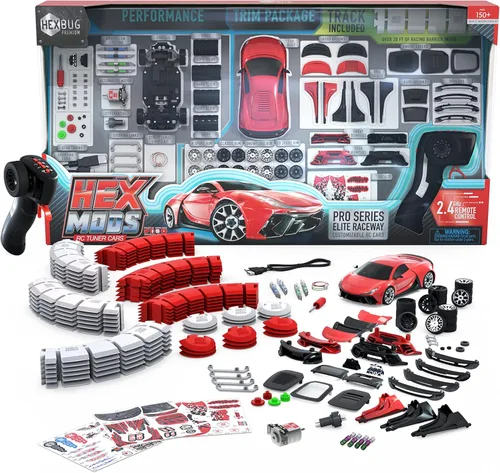 HEXMODS Pro Series Elite Raceway es el paquete principal de los juegos de construcción de autos modelo RC de grado pasatiempo con miles de combinaciones de mods. Este conjunto eleva las posibilidades de HEXMODS con más estilos de carrocería, capós, faldas laterales, parachoques, opciones de techo, cubiertas de motor, alerones y llantas alternativas. Este kit STEM también incluye más mejoras de rendimiento, como tracción total y una selección de suspensiones intercambiables, eslabones de dirección, neumáticos de diferente fuerza de agarre y diferentes configuraciones de engranajes y motores para controlar la velocidad de estos modelos de automóviles. El chasis maneja velocidades de hasta 26 pies por segundo, ¡eso es 18 mph! Añade tu propio destello con calcomanías, un kit de luces legales de calle que incluye faros de trabajo, luces traseras y luces LED para iluminar cualquier circuito. Viene con un control remoto de 2.4 GHz para dirección y juego de nivel superior, además de una bonificación de más de 20 pies de barrera conectable para hacer tu propia configuración de pista para llevar tu experiencia de carrera al siguiente nivel. HEXMODS Pro Series Elite Raceway incluye un chasis de auto sintonizador RC de grado hobby listo para velocidades de hasta 18 mph, todos los mods estéticos, además de suspensión intercambiable y configuraciones de engranajes ajustables. Coches RC modificables con chasis universal reconfigurable. Actualizaciones de rendimiento para cambiar las capacidades de conducción. Puede incorporar mejoras estéticas.