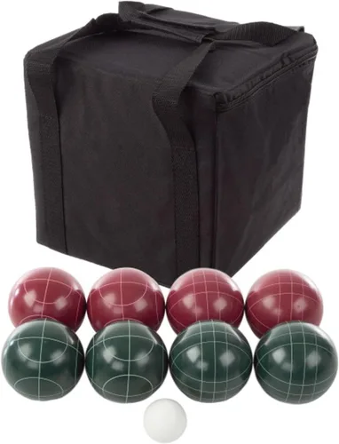 • BOCCE BALL GAME SET - This classic bocce or petanque game set is great for outdoor yard games and includes 4 green and 4 red bocce balls to represent two teams for tournament-style play or just for hours of ball game fun. QUALITY MATERIAL - The 8 bocce balls are made with a high-quality polyresin compound material that resists cracking and damage for long-lasting fun, ideal for outdoor lawn games or beach games. A pallino is also included. PLAY ANYWHERE - This lawn bocce ball set is one of the most classic backyard games for adults and family. Take it with you to the park, beach, barbecue parties, campgrounds, or your neighbor's yard for some friendly bocce or petanque game competition. CARRYING CASE INCLUDED - The bocce accessories conveniently fit inside the included black carrier case with handles for easy storage and transport to outdoor activities, such as beach games for adults and families. PRODUCT DETAILS - Materials: Polyresin Composite. Dimensions: Bocce Ball: (L) 3.93"