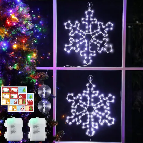 • bajo consumo de energía y buena disipación de calor Ventosa para colgar: esta luz de Navidad de silueta viene con un gancho de ventosa de 2 pulgadas de diámetro para colgar fácilmente, simplemente coloca el agujero colgante de la decoración de silueta de ventana iluminada en el gancho de ventosa, presiona la ventosa en la puerta o ventana de vidrio, o pared de cerámica con la fuerza adecuada para asegurarse de que se fija lo suficientemente firmemente para colgar Lo que obtendrás: recibirás 2 luces grandes de copo de nieve con caja de batería y 2 ganchos de ventosa y 18 calcomanías de Navidad de papel de aluminio, añade un toque especial a tu envoltura de regalo de Navidad con calcomanías decorativas con nombre para tus amigos y familiares
