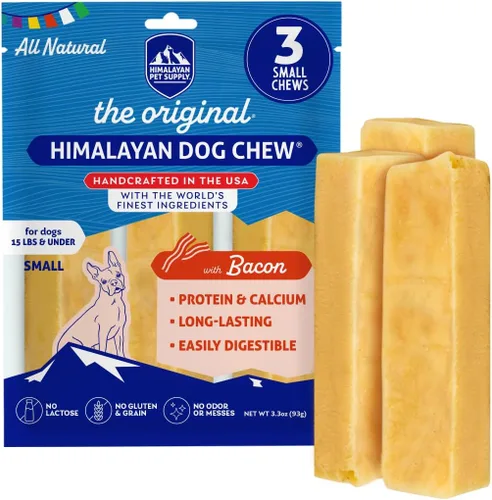 Masticables para perros del Himalaya con queso yak: Hacemos especialmente nuestros masticables para perros con una antigua receta del Himalaya de las montañas de Nepal. Cada masticable de perro del Himalaya está expertamente elaborado a mano por artesanos utilizando técnicas antiguas transmitidas a través de familias durante cientos de años. Solo Queso: Este es un snack para perros totalmente natural y muy nutritivo hecho sin aglutinantes, conservantes ni aditivos. Nuestras golosinas masticables de yak del Himalaya están elaboradas con leche pasteurizada de yak y de vaca mediante un proceso único de curado que elimina la lactosa y garantiza que se cumplan los requisitos de seguridad alimentaria, haciéndolas suaves para estómagos sensibles. Masticables para perros de larga duración: cuando le das un masticable para perros del Himalaya a tu perro, sabes que les estás proporcionando entretenimiento de masticación de calidad. Nuestros masticables para perros de larga duración pueden ayudar a mantener ocupados incluso a los masticadores más agresivos, ya que los perros deben trabajar el extremo del yak chew durante horas, suavizándolo con sus bocas antes de masticar lentamente pequeñas piezas. Fácil de digerir: los masticables para perros del Himalaya se digieren mejor que los masticables estándar de cuero crudo y los bully sticks. Los bocadillos para perros son libres de lactosa, sin granos y sin gluten, lo que los hace fácilmente digeribles para cualquier tipo de raza de perro. Sabor a tocino: se incluyen 3 pequeños palitos de queso de yak del Himalaya con sabor a tocino (1.1 oz cada uno), hechos con nuestra receta tradicional de queso del Himalaya, pero con trozos adicionales de tocino para más sabor Ideal para perros de 15 libras y más pequeños, no para perros menores de 12 semanas.