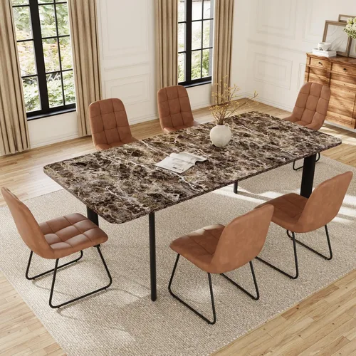 Juego extensible de 6 a 8 asientos con 6 sillas: esta mesa de comedor extensible comienza en 63 pulgadas, por lo que puede acomodar fácilmente de 4 a 6 personas para comidas diarias. Cuando necesites más espacio para cenas familiares o reuniones de amigos, simplemente estíralo a 78.7 pulgadas para adaptarse cómodamente a hasta 8 personas, no más preocuparte por no tener suficientes asientos. Ocupa muy poco espacio cuando no se extiende, lo que es perfecto para apartamentos pequeños o comedores compactos, y viene con 6 sillas de piel sintética a juego. No necesitarás comprar asientos adicionales por separado, lo que lo convierte en un versátil juego de mesa de comedor que funciona tanto para el uso diario como para grandes eventos. Aspecto de mármol MDF y piel sintética fácil de limpiar: el juego de mesa de comedor para 6 personas tiene una mesa de MDF de alta calidad con un acabado similar al mármol. Su textura natural y elegante eleva tu espacio sin parecer barato. La mesa es impermeable, resistente a los arañazos y se limpia en segundos: derrames de sopa, salpicaduras de café o suciedad de alimentos de los niños no dejarán manchas y los platos calientes no marcarán la superficie. Las 6 sillas de piel sintética son suaves en la piel, no se pegan a la ropa durante comidas largas, y las manchas menores también se limpian fácilmente. Mesa y sillas estables sin tambaleo – La mesa de comedor moderna de MDF con aspecto de mármol utiliza patas de acero grueso y marcos inferiores reforzados para mantenerse completamente estable. Se mantiene estable incluso cuando los niños se inclinan sobre él, colocas ollas pesadas o pasas platos a través de la mesa, y soporta hasta 260 libras de manera segura. Cada silla de cuero sintético para mesa de comedor tiene soportes de asiento reforzados, por lo que no se hundirá incluso con uso diario, y puede soportar de manera segura hasta 330 libras por silla, adecuada para adultos de todos los tamaños. Tanto la mesa como las sillas tienen patas de goma ajustables para proteger los suelos de madera dura y las baldosas de arañazos y mantenerse niveladas en suelos irregulares. Montaje sin complicaciones con todas las herramientas: no necesitas comprar herramientas adicionales: este juego de mesa de comedor rectangular para 6 viene con todos los accesorios necesarios, un manual paso a paso y herramientas básicas de montaje para comenzar. Si tiene un taladro eléctrico, ayudará a acelerar aún más el proceso de ensamblaje, por lo que puede omitir largas esperas en la configuración y comenzar a usar su nueva mesa antes. Versátil para múltiples espacios: esta mesa de comedor expandible funciona como una mesa de cocina para cereales matutinos, una mesa de comedor para banquetes festivos, y una mesa de rincón de desayuno para refrigerios casuales. Las 6 sillas de piel sintética también funcionan como asientos adicionales en la sala de estar para noches de cine o en la oficina en casa para los invitados. Su diseño elegante combina con la decoración moderna, adaptándose a todas tus necesidades diarias.