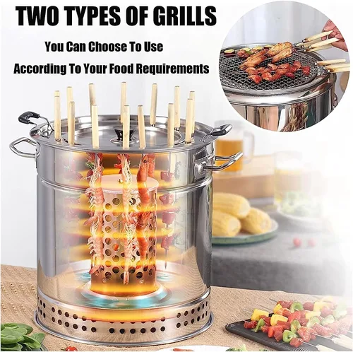 Parrilla de barril de carbón multifunción: la parrilla de barbacoa de barril de carbón se puede utilizar no solo como una estufa colgante de barbacoa, sino que también sirve como una parrilla de malla, dos formas se pueden utilizar de acuerdo con sus ingredientes. Gran capacidad puede hornear 20 porciones de alimentos al mismo tiempo para que varias personas las utilicen Diseño de separación de aceite y carbono: la estufa colgante para barbacoa tiene una bandeja de aceite incorporada, cuando el aceite de tostado gotea en la bandeja de aceite de abajo, puede separar eficazmente el fuego de carbón, eliminar los humos de aceite de la fuente y lograr un efecto de barbacoa sin humo. Se puede utilizar en interiores y exteriores Material de acero inoxidable: la parrilla de barril de carbón está hecha de acero inoxidable 304 de grado alimenticio, la pared circular del horno refleja el calor dos veces, horneado de ciclo completo de 360°, para lograr un exterior crujiente y tierno en el interior, y un mejor sabor Fácil de usar: el funcionamiento es simple, coloca el carbón en el barril de fuego de carbón, añade la cantidad adecuada de agua a la bandeja de aceite, y finalmente coloca la comida ensartada en el estante, solo tarda unos minutos en satisfacer la comida de más de diez personas Fácil de limpiar: el barril de parrilla de barbacoa se puede desmontar para una limpieza más fácil, después de enjuagar con agua, no se adhiere al aceite ni al óxido, y se puede reutilizar. Se puede colocar en el maletero del automóvil y es fácil de llevar. La cocina perfecta para picnics o acampar con familiares y amigos los fines de semana