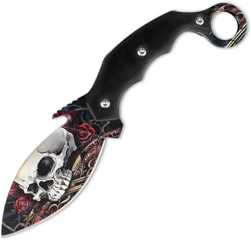 [Cuchillo táctico estándar] Longitud total: 8.7 pulgadas, longitud de la hoja: 3.5 pulgadas, grosor de la hoja: 0.16 pulgadas, ancho de la hoja: 1.65 pulgadas, longitud del mango: 4.92 pulgadas, el artículo pesa 5.25 onzas. Nuestro cuchillo táctico de supervivencia para exteriores es una hoja fija de espiga completa fabricada con acero D2. Con el mango de madera de ébano, Ebony tiene una dureza muy alta y no es fácil de llevar durante el uso. El cuchillo está diseñado con un abridor de botellas, así que no olvides usarlo cuando tengas sed y quieras beber una botella de cerveza al aire libre. [Impresión superficial de calavera] Exquisitos patrones de alta definición sobre Skull&Rose están impresos en la superficie del cuchillo mediante un proceso de impresora de inyección de tinta LED ultravioleta. El patrón impreso en la cara del cuchillo es muy resistente al desgaste y no se cae fácilmente, la característica cara del cuchillo te hace la persona más llamativa. [Diseño exquisito del mango] La forma del mango está diseñada con un diseño ergonómico, gracias al diseño de ranuras apropiadas para los dedos, permite que el soporte del cuchillo realice una variedad de acciones y funcione mejor, mejora la experiencia de usar el mango o el control de la hoja de este cuchillo táctico. La existencia del bucle de dedo del cuchillo permite tener la forma de sujeción de insertar los dedos, lo que hace que el cuchillo sea más jugable. [Escenario multiaplicación] Cuchillo de supervivencia al aire libre para caza, camping, senderismo, pesca, emergencia, actividades en interiores y exteriores. Este es un regalo perfecto para hombres o mujeres que aman la actividad al aire libre. [Garantía de servicio de venta] Si tienes alguna pregunta, no dudes en ponerte en contacto con nosotros. Resolveremos su problema tan pronto como sea posible dentro de las 24 horas.