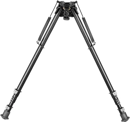 Este bípode está hecho de acero resistente y aleaciones de aluminio, acabado anodizado resistente, tapas de goma dura. Esto le da al tirador una ventaja adicional al disparar desde superficies duras. Con un toque de botón, las patas son ajustables de 13 a 27 pulgadas. A diferencia de los modelos cortos, la plataforma de soporte se hace móvil en relación con el eje horizontal, lo que permite compensar las irregularidades de la superficie de soporte. Se fija al perno giratorio o adaptadores de bípode al riel picatinny o al guardamanos Gira (inclinación) para compensar terrenos irregulares. Esto es muy conveniente cuando se dispara desde áreas con un ángulo constante o terreno irregular. Este bípode está equipado con palanca de trinquete S Lock, reemplaza la perilla de ajuste de tensión para un control de nivel más fácil y firme.