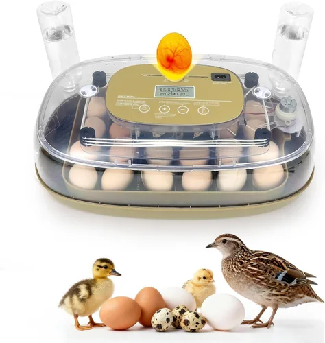 Capacidad ajustable para múltiples tipos de huevos: las bandejas divisoras flexibles se adaptan a varios tamaños de huevos, ideales para huevos de pollo, pato, codorniz, ganso, pavo y paloma. Los modelos pueden contener hasta 24 huevos de gallina o 48 huevos de codorniz, permitiéndote personalizar el espacio para huevos tanto pequeños como grandes. Control estable de temperatura y humedad: equipada con un avanzado termostato PID y sensor de humedad preciso, la incubadora mantiene condiciones estables a 99.5°F ±0.5°F y 55-65% de RH. Un sistema de circulación de aire de 360° elimina los puntos calientes y fríos, mientras que las alertas de sobretemperatura y bajo nivel de agua ayudan a proteger los huevos y a mantener tasas de eclosión más altas. Sistema de recarga de agua automático externo: recarga agua sin abrir la tapa para evitar la pérdida de calor y humedad. Los tanques externos grandes suministran agua automáticamente para mantener la humedad ideal, reduciendo las recargas frecuentes. Adecuado para pollos, codornices, patos, gansos, palomas y mucho más. Giro automático inteligente de huevos: el girador automático integrado gira los huevos cada 60/120/180 minutos (ajustable por especie) para garantizar un calentamiento uniforme y un desarrollo saludable del embrión. El giro se detiene automáticamente de 3 a 4 días antes de la eclosión, imitando el comportamiento de una gallina clueca natural para mejorar el éxito de la eclosión. 【Pantalla LCD inteligente fácil de usar】 La pantalla digital intuitiva muestra la temperatura en tiempo real, la humedad, los días de incubación, la cuenta regresiva para girar los huevos y alertas del sistema. Fácil de montar, operar y limpiar, perfecto para principiantes, aulas, pequeñas granjas y criadores domésticos. Construcción silenciosa, duradera y segura: Hecho de ABS grueso ignífugo con una tapa de bloqueo segura para niños y alfombrilla antideslizante. El ventilador de turbina de alta calidad funciona silenciosamente a menos de 30 dB. Cuenta con componentes duraderos y bandejas extraíbles para una limpieza sin esfuerzo, lo que lo convierte en una opción confiable para la incubación a largo plazo. [Tapa de Visualización Transparente de 360° y Candler Integrado] La cubierta panorámica completamente transparente te permite observar todo el proceso de incubación y eclosión sin levantar la tapa. Un ovoscopio LED integrado facilita verificar la fertilidad y el desarrollo del embrión en cualquier momento, sin necesidad de herramientas adicionales. Garantía de 100% Satisfacción] Estamos dedicados a ofrecer productos de alta calidad y un servicio excepcional. Si tiene alguna pregunta o inquietud, no dude en comunicarse con usted, ¡estamos aquí para ayudar! Cómo contactarnos: Inicia sesión en tu cuenta de Amazon → ve a "Tus pedidos" → encuentra tu ID de pedido → haz clic en "Contactar con el vendedor."