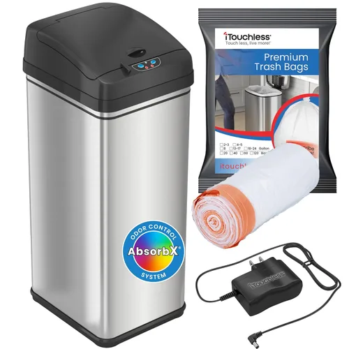iTouchless Bote de basura automático de acero inoxidable de 13 galones con adaptador de corriente alterna y 10 bolsas de basura de alta calidad. Bote de basura con sensor 100 % sin contacto con compartimento de filtro de olor y un filtro de olor. El filtro de olor reemplazable puede durar hasta 3 meses. Bote de basura sin contacto alimentado por adaptador de corriente alterna incluido o 4 pilas de tamaño D (no incluidas).