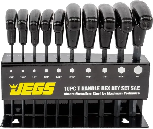 JEGS Juego de llaves hexagonales con mango en T de 10 piezas | SAE | Longitud del eje de 3 3/4 pulgadas | Empuñaduras de plástico con ejes de acero