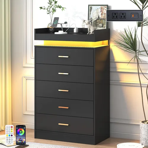 jiteentarou Cómoda de 5 cajones con estación de carga y luces LED, cómoda moderna con toma de corriente, armario organizador para dormitorio, sala