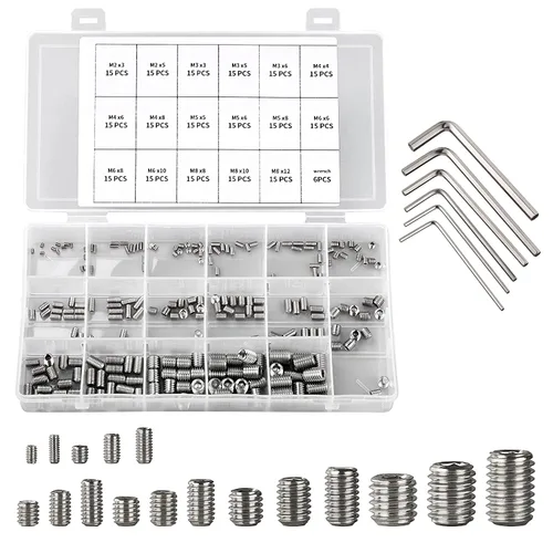 VARIOS TAMAÑOS: Cabeza hexagonal de tornillo de retorno: M2*0.118 in, M2*0.197 in, M3*0.118 in, M3*0.197 in, M3*0.236 in, M4*0.236 in, M4*0.315 in, M5*0.197 in, M5*0.236 in, M5*0.315 in, M6*0.236 in, M6*0.315 in, M6*0.394 in M8*mm 0.315 in, M8 x 0.394 in, M8 x 0.472 in, 15 piezas de cada tamaño, para satisfacer tus diferentes necesidades MATERIAL PREMIUM: el juego de tornillos Allen Cup-Point está hecho de acero inoxidable 304, que es una opción flexible, robusta y resistente a la corrosión que puede ofrecer resultados consistentes para una amplia gama de tareas de sujeción Amplia aplicación: el juego de tornillos hexagonales es adecuado para manijas de puertas, grifos, accesorios de iluminación, perillas, reparación de armamento de muebles de madera y otras pequeñas reparaciones alrededor de la tienda, garaje o hogar PRÁCTICO: Se trata de tornillos de fijación sin cabeza con rosca continua y un zócalo hexagonal en el extremo. El tornillo hexagonal no se deforma fácilmente y no se desliza durante el rodamiento. Se puede convertir en un hilo de acoplamiento hasta que desaparezca por completo. Esto lo hace casi invisible, lo que es ventajoso para varias aplicaciones ALMACENAMIENTO: Equipado con una caja surtida de plástico, puede clasificar los tornillos métricas de Grub de una manera organizada y llevarlos más cómodamente. Esto hace que sea fácil almacenar y transportar tornillos pequeños sin mezclarlos