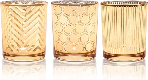 Iluminación romántica: estas 3 velas de té difunden suavemente la luz de sus velas, lo que resulta en una iluminación dorada y romántica. Cada patrón crea un efecto de iluminación distinto, transformando cualquier entorno en un refugio de comodidad Patrones geométricos únicos: estos candelabros votivos dorados cuentan con tres patrones diferentes y encantadores: panal, rayas verticales y líneas onduladas. El diseño de patrones geométricos añade en gran medida una sensación de sofisticación a tu hogar moderno Dimensiones perfectas: con una altura de 3.3 pulgadas, un diámetro interior de 2.2 pulgadas y un diámetro exterior de 2.8 pulgadas, estos candelabros están perfectamente proporcionados para sostener cómodamente la mayoría de las velas de té y velas votivas Construcción de alta calidad: estos candelabros no solo son visualmente atractivos, sino que están diseñados para durar. Hecho de vidrio grueso resistente al calor, pueden soportar de forma segura el calor generado por tus velas. El vidrio es fácil de limpiar y mantener Versátil y multifuncional: estos portavelas votivas de vidrio no son solo candelabros, son una puerta de entrada para crear recuerdos especiales. Perfecto para bodas, Navidad, fiestas, cumpleaños o simplemente para el uso diario en tu mesa de comedor