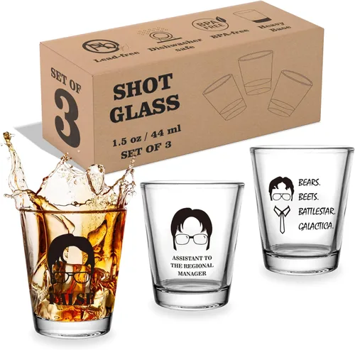 Juego de 3 vasos de chupito The Office Merchandise de 1.5 onzas, vasos transparentes con base pesada, divertidos regalos de oficina para hombres, mujeres o fanáticos del programa de televisión de la oficina, palabras de Dwight Schrute