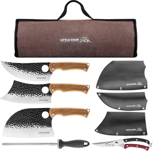 1. Juego completo de cuchillos de carnicero de 9 piezas para cada aventura culinaria: este juego de cuchillos de carnicero de 9 piezas es una solución integral para todas las necesidades de cocina, diseñado para hacer que cada tarea culinaria se sienta sin esfuerzo. El juego de cuchillos de camping incluye un potente cuchillo de carne de carnicero de 7 pulgadas, un cuchillo de chef serbio de 7 pulgadas, un cuchillo vikingo de 6.5 pulgadas, tres fundas a juego, tijeras de aves de corral de alta calidad, un acero para afilar y una bolsa de rollo de cuchillos. 2. Cuchillas forjadas a mano con agujero único para los dedos: Cada cuchillo de carnicero en carnicero este juego está forjado a mano por expertos, un proceso que no solo mejora la durabilidad, sino que también le da a cada hoja una textura única y artesanal que refleja la alta artesanía de la fabricación tradicional de cuchillos. El distintivo agujero para los dedos en cada hoja ofrece un control adicional, lo que permite a los chefs agarrar la hoja más cerca para cortes precisos y seguros. Las asas ergonómicas de madera proporcionan un agarre cómodo y seguro, reduciendo la fatiga de la mano y permitiendo un uso prolongado. 3. Emblema de toro audaz que simboliza fuerza, determinación y calidad: a diferencia de los juegos de cuchillos de carnicero ordinarios, este está decorado con un llamativo patrón de toro en cada mango de cuchillo, funda y bolsa de rollo de cuchillos. Este diseño exclusivo representa las cualidades de resistencia, fuerza y determinación, perfecto para cocineros que no tienen miedo de abordar recetas ambiciosas y desafíos culinarios. El emblema del toro le da a este cuchillo de buter para cortar carne una identidad única y lo convierte en una pieza de declaración en cualquier cocina. 4. Bolsa de rollo de cuchillos conveniente y elegante para un almacenamiento seguro y fácil transporte: el juego de cuchillos vikingos incluye una bolsa de rollo de cuchillos duradera, diseñada para proteger su inversión y garantizar un transporte seguro y fácil. Hecha de materiales de tela de alta calidad, esta bolsa es lo suficientemente resistente como para soportar el uso regular y los viajes, mientras que el diseño enrollable mantiene todo compacto y organizado. Cada cuchillo de carnicero tiene su espacio designado, evitando que las cuchillas colisionen y se emboten con el tiempo. 5. Accesorios adicionales para una experiencia culinaria verdaderamente todo en uno: este juego de cuchillos de carnicero no solo se detiene en los cuchillos, sino que también incluye tijeras para aves de corral de alta calidad y un acero para afilar para mejorar su experiencia de cocina. Las tijeras para aves de corral están diseñadas para cortar de alta resistencia, lo que hace que tareas como cortar pollo, cortar huesos de pescado o manipular verduras más duras sean fáciles y eficientes. Mientras tanto, el acero de afilado garantiza que tus cuchillos se mantengan afilados con el tiempo, preservando su eficacia y prolongando su vida útil.