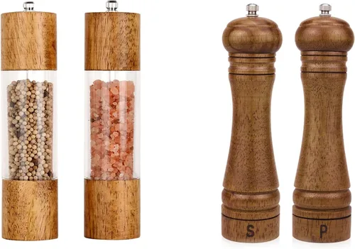 Dos molinillo acrílico de sal y pimienta con diseño de madera. Diferentes molinillo de pimienta y molino de sal para decorar tu cocina y hogar.