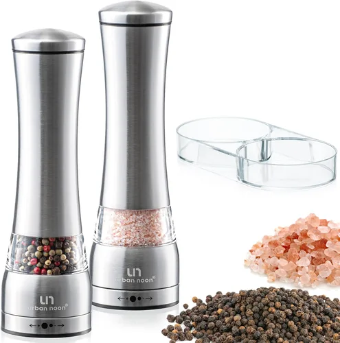 Diseño único: Nuestros elegantes molinillos de sal y pimienta con bandeja de acrílico te cautivan por su diseño, funcionalidad y se ajustan perfectamente a tu mano. Aportan un toque elegante a tu cocina, mesa de comedor o restaurante mientras destacan entre todos los molinillos de sal y pimienta de cuerpo de vidrio. No tienes que preocuparte por tener vidrios rotos por todas partes Este hermoso conjunto siempre impresionará: las cosas elegantes pertenecen a un empaque elegante. Es por eso que nuestro moderno molinillo de sal y pimienta negra viene en una caja de regalo premium. Así de fácil es dar regalos con estilo, ya sea para inauguración de casa, aniversario, boda o si estás buscando ideas de regalos navideños Calidad premium: el molinillo manual de sal y pimienta está hecho de acero inoxidable cepillado de la más alta calidad con una ventana acrílica. Molinillo de cerámica duradero que muele fácilmente sal, pimienta y especias. La granularidad es fácilmente ajustable para moler sal fina o gruesa o granos de pimienta Reduce los recambios constantes: Nuestro molinillo alto de sal y pimienta es fácilmente recargable gracias a la capacidad extra grande del contenedor. Una tapa especial con sello aromático hermético mantiene tu sal del Himalaya, marina o kosher, y pimienta o especias frescas y alejadas de la humedad no deseada. No más migas de especias en tu mesa de comedor gracias a la bandeja a juego Sin riesgo: nuestros productos Premium están respaldados por una garantía extendida y un servicio al cliente excepcional. Si por alguna razón no está satisfecho con su molinillo de sal y pimienta, simplemente contáctenos y con gusto nos ocuparemos de usted. *Sal y pimienta no incluidas