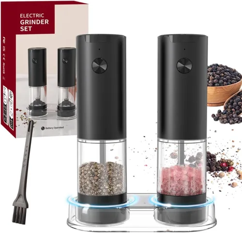 DISEÑO DE CONTENEDOR TRANSPARENTE MÁS GRANDE: Hemos aumentado la capacidad de nuestros recipientes transparentes de 2.4 fl oz a 3.0 fl oz, puedes almacenar más sal y pimienta en tus botellas de condimentos y reponerlos con menos frecuencia. Esto te ahorra tiempo y energía en la cocina Funcionamiento con una sola mano con luz LED: nuestro juego de molinillo eléctrico de sal y pimienta está diseñado pensando en la comodidad. Con la luz LED incorporada, puedes ver fácilmente cuánta sal o pimienta has añadido a tu plato incluso en condiciones de poca luz PERILLA DE AJUSTAMIENTO DE 5 NIVELES: La función de ajuste grueso y fino le permite personalizar fácilmente el tamaño de la molienda para adaptarse a sus preferencias de sabor. Ya sea que prefieras una molienda fina o gruesa, nuestro kit de molino de frijoles te tiene cubierto BATERÍA CON BASE TRANSPARENTE: En el paquete que recibe, además de la parte principal del juego de molinillo de sal y pimienta que funciona con pilas, también hay un cepillo para limpiar la sal o pimienta restante debajo y una base transparente para que almacene el juego de molinillo. Nota: el molinillo eléctrico requiere 4 pilas alcalinas AAA Regalo perfecto: el juego de salero y pimentero es un regalo ideal para tus amigos de chef, mamá y compañeros de trabajo para Navidad, Acción de Gracias, inauguración de la casa, boda o aniversario