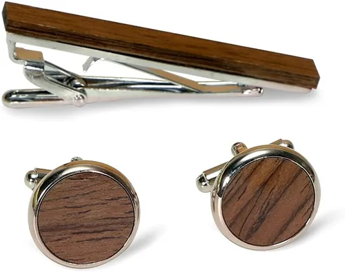 Juego de pinzas de corbata de madera y gemelos para hombres, juegos de clips de corbata de 2 pulgadas para hombres con incrustaciones de madera y gemelos redondos con caja de regalo, juego de clips de corbata para negocios formales y bodas