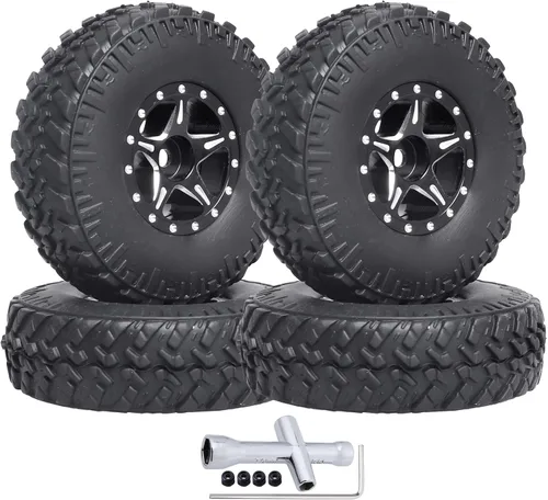 No es compatible con TRX4M, compatible con Axial SCX24, Axial SCX24 Gladiator, Deadbolt, Bronco, C10, JLU CRC, B-17 Betty y Chevy AX24. Diseñado específicamente para los modelos Axial SCX24 escala 1/24, este juego de ruedas y neumáticos beadlock garantiza un ajuste perfecto sin necesidad de amplias modificaciones, lo que hace que el proceso de instalación sea fácil. Ruedas Beadlock: El juego incluye ruedas beadlock que bloquean de forma segura los neumáticos en las llantas, evitando el deslizamiento y asegurando una mayor estabilidad mientras navegan por terrenos difíciles. Diámetro exterior de los neumáticos: 2.126 in, ancho: 0.669 in, diámetro interior de la rueda: 0.846 in, tamaño hexagonal: 0.276 in, agujero del eje: 0.118 in. El paquete incluye: 4 llantas Micro Beadlock 1.0, 4 neumáticos 1.0 con espuma, 4 tuercas de bloqueo M2, 1 llave de rueda cruzada Aspecto elegante: mejora el atractivo visual de tu rastreador RC con el juego de ruedas y neumáticos AllinRC 1.0 Beadlock, añadiendo un toque de realismo y estilo a tu vehículo durante tus aventuras a control remoto.