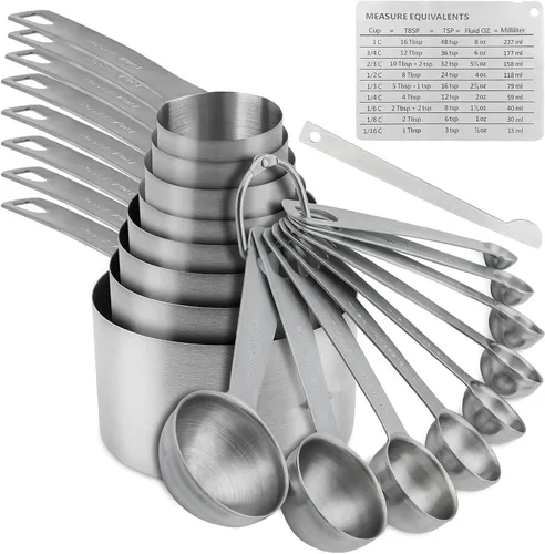 Alta calidad: Hecho de acero inoxidable 18/8 (304), no lo harán ser contaminado o erosionado, prueba, sin plomo, BPA libre, durable y eco- amigable es muy práctico y duradero. Acero de alta calidad que lo hace Apto para lavavajillas, que es seguro de usar tanto en seco como en húmedo. ingredientesóxido. Diseño simple: cucharas y tazas medidoras están grabadas con fácil Lee los tamaños de medición que nunca se desgastan, proporciona precisión capacidad para hornear y cocinar, además de un diseño de anidación para facilitar almacenamiento y organización. Utensilios de medición de cocina profesionales: medir la cantidad correcta de leche, aceite, agua, jarabes, sal y así sucesivamente; nueces, arroz, harina u otro seco e ingredientes líquidos; mejor para cocinar y hornear. Tamaño de las tazas medidoras: 1 taza - 8.1 fl oz, 3/4 tazas - 6.1 fl oz, 2/3 tazas - 5.4 fl oz, 1/2 taza - 4.1 fl oz, 1/3 taza - 2.7 fl oz, 1/4 taza - 2.0 fl oz. 1/8 taza - 1.0 fl oz, 1/16 taza - 0.5 fl oz, cucharas medidoras: 4 cucharadas - 0.7 fl oz, 1 cucharada - 0.5 fl oz, 2/3 cucharada- 0.3 fl oz, 1/2 cucharadita - 0.3 fl oz, 1 cucharadita - 0.2 fl oz, 3/4 CUCHARA - 0.1 fl oz, 1/2 cucharada - 0.1 fl oz, 1/4 cucharada - 0.0 fl oz, 1/8 cucharada - 0.0 fl oz. Garantía de satisfacción: si no está satisfecho con el juego de tazas y cucharas medidoras de Smithcraft, háganoslo saber y le proporcionaremos una garantía de satisfacción del 100%
