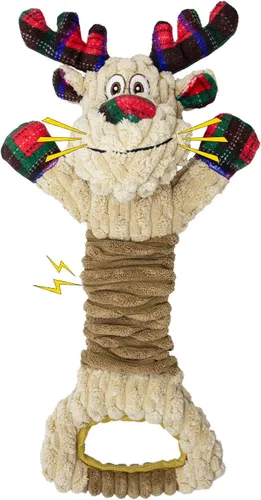 Chirriadores atractivos incorporados: los perros son muy sensibles al sonido. Nuestro juguete chirriante de Navidad integrado con chirriadores cuidadosamente distribuidos por todo el juguete, puede despertar eficazmente el interés de los perros y estimular su deseo de jugar. Una vejiga vocal en la cabeza y papel arrugado en la cola, que emite sonido cuando las mascotas muerden y aumenta enormemente el interés de tu perro en jugar con el juguete MATERIALES SEGUROS Y DISEÑO PARA TIRAR DE LA GUERRA: Los juguetes para perros con sonido LSSYYQQ están hechos de tela de terciopelo elástico y algodón de felpa, que tienen una sensación súper segura, suave y cómoda, El diseño del anillo de cuerda es más adecuado para jugar al juego de tirar de la guerra, lavable a máquina, limpie las manchas con una toalla húmeda para uso diario LIMPIEZA DE DIENTES Y SALUD ORAL: Los juguetes masticadores para perros LSSYYQQ son buenos para que tu cachorro mantenga los dientes limpios y agresivos, las mascotas aumentarán el ejercicio para mantener el peso y la salud jugando con el juguete, movilizarán la actividad cerebral de tu perro, déjalos ocupados Regalos Preferidos para Perros: bonita forma de ciervo de Navidad, los juguetes chirriantes de peluche de LSSYYQQ son la opción de regalo perfecta para tu perro durante estas memorables vacaciones, vacaciones de Navidad, sesiones de fotos y otras actividades, diseño ligero en forma de ciervo y tamaño adecuado, se adaptará a perros de todas las edades y tamaños, no importa si es una raza pequeña, mediana o grande Completamente hecho a mano: patrones de bordado delicados, costura perfecta, hecha a mano con amor y cuidado, llevando el ingenio y el amor del artesano por los perros. Mucho superior a la calidad de otros juguetes para perros, cuando lo recibas, encontrarás que vale la pena tenerlo.