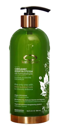 KERARGANIC El sistema de queratina orgánica premium – 0% de formaldehído – STEP 2 es el tratamiento de queratina más seguro en el mercado hoy en día. Repleto de una variedad de extractos y aceites naturales, ingredientes orgánicos certificados y aceite de argán, restaura la salud del cabello dañado, eliminando el encrespamiento y reduciendo el volumen. Además de aminoácidos esenciales y ácidos grasos y vitaminas, la queratina hidrolizada natural se sella de nuevo en las fibras durante el tratamiento. El primer tratamiento de queratina que cuenta con oro coloidal en su formulación, da brillo extra, fuerza y elasticidad a las fibras capilares.