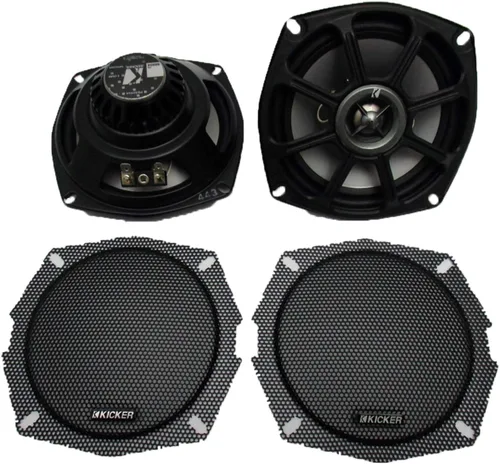 PS5250 Harley-Davidson Kicker Powersports - Altavoces coaxiales de 2 ohmios de 5.25 pulgadas, resistentes a la intemperie, coaxiales de alta eficiencia creados específicamente como carenado en motocicletas, también se utiliza con sistemas ATV, UTV, marino o al aire libre, también disponible en resistencia de 4 ohmios para compatibilidad con unidades principales Harley-Davidson OEM 2006 (ver PS522) 504), Extremadamente potente para ser escuchado sobre el rugido de la carretera mientras se usa un casco, la estructura magnética de neodimio de Midbass proporciona un alto rendimiento con bajo peso. Tweeters de cúpula de neo-titanio de 0.78 pulgadas increíblemente detallados, de alta potencia, tweeters montados en puente suspendidos sobre el cono de bajo medio para limitar la vibración extrema, con solo 12 onzas por altavoz, el centro de gravedad de una bicicleta permanece bajo para un manejo adecuado, materiales resistentes a la intemperie diseñados para soportar los elementos exteriores, incluye rejillas de repuesto específicas para el carenado "Bat-wing" de Harley-Davidson, 2-Oh! m modelo para la victoria motos y la primera modelo Harley-Davidson. Detalles técnicos: PS5250 Harley-Davidson Kicker Powersports 5.25" Altavoces coaxiales de 2 ohmios, pico de 100 vatios, 50 vatios RMS, Woofer: 5.25" (13.3cm), Tweeter: 3/4" (20mm), Impedancia: 2 ohmios, Peso: 12.6 oz (358 g), Sensibilidad: 88.3 dB, Respuesta de frecuencia: 60 - 20,000 Hz, Diámetro del orificio de montaje: 4 7/8 in (12,4 cm), Profundidad de montaje: 2 3/16" (5,6cm), rejillas incluidas: Sí - Se adapta al carenado Harley Bat Wing. Todos los demás carenados deben usar rejilla de fábrica.