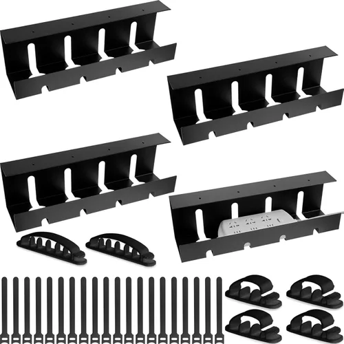 El paquete incluye: 4 bandejas de gestión de cables debajo del escritorio, 10 bridas de nailon para cables, 2 organizadores de alambre con 5 divisiones, 2 organizadores de alambre con 3 divisiones y 10 bridas de gancho y bucle Gran capacidad y 4 agujeros: el organizador de cables de escritorio mide aproximadamente 15.75 x 3.94 x 4.72 pulgadas, con gran capacidad para regleta de alimentación; hay 4 agujeros, que son más convenientes para transportar cables, no causando cables más terribles y peligrosos en tu espacio de trabajo Material de metal de calidad: la bandeja para cables de escritorio está hecha de material de acero sólido de calidad, seguro y confiable, resistente y duradero, no se deforma ni rompe fácilmente, lo que puede servirte durante mucho tiempo Fácil de instalar: se incluyen tornillos y pegamento acrílico, y hay 2 formas de instalación, incluyendo la instalación sin taladro, adecuado para mesa de azulejos, mesa de madera y mesa de vidrio, e instalación sin tornillos adecuada para la mayoría de escritorios Amplia aplicación: este organizador de cables debajo del escritorio es un accesorio ideal para varias ocasiones, como dormitorio, oficina, cocina, sala de estar, sala de estudio y otros lugares, lo que te proporciona una experiencia de usuario cómoda
