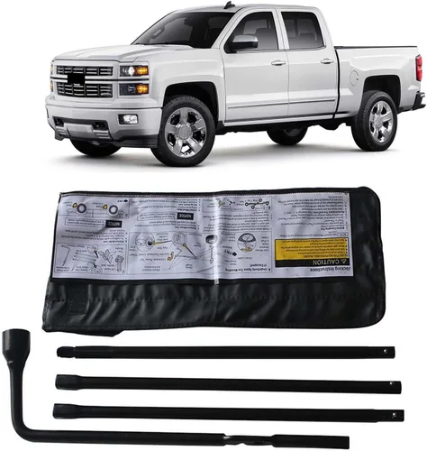 Diseñado para adaptarse a: Chevy Silverado 2000-2014 (no incluye híbrido) El paquete incluye: 1 llave de tuerca de neumático + 1 pieza que se engancha en tu gato + 2 piezas de extensión + 1 estuche de almacenamiento Afloja o aprieta las tuercas de las llantas; baja el neumático de repuesto desde debajo del vehículo; levanta el gato que viene con tu vehículo (Nota: gato no incluido) Material: acero recubierto de polvo resistente con estuche de transporte conveniente OEM REF: 22969377, 20782708, 22925285, 20782706, 22969370,15854614