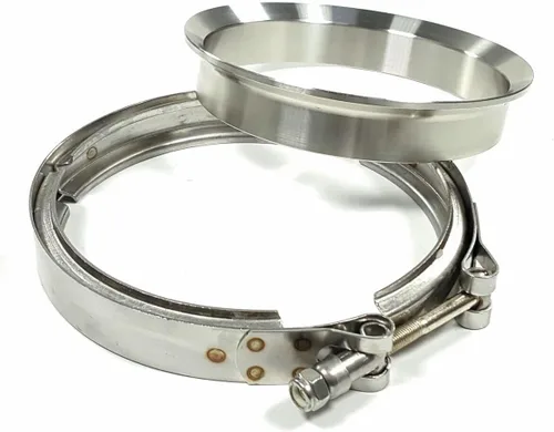 Conjunto de brida y abrazadera de banda en V para la salida de turbina (lado del tubo) en todos los turbos DIVIDED T6 con brida (marco grande) de la Serie 400, S, SX y SX-E con la cara biselada. No para la carcasa "T4" más pequeña en estos turbos que tiene la cara plana La brida mecanizada de acero inoxidable de grado 304 tiene un diámetro exterior de 5 pulgadas para acoplarse a un tubo de 5 pulgadas El diámetro exterior de la brida (OD) de la brida en el alojamiento debe ser de 5.75" Aplicación para Borg Warner S400 S400SXE S475 S480 S463 S467 SX-E SX