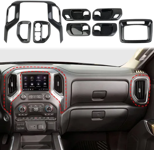 Lista compatible: ajuste perfecto para Chevrolet Silverado 1500/GMC Sierra 1500 2019-2026, Silverado 2500 3500 2020-2025 y Sierra 2500 3500. No es compatible con el nuevo interior de la plata 22-23 / sierra. Compara nuestras imágenes antes de realizar el pedido Material: hecho de material plástico ABS de alta calidad, procesamiento de tres capas: 1/pintura negra de fondo, 2/pintura de patrón de fibra de carbono, 3/UV transparente en gran acabado con gran brillo (no fibra de carbono real) Fácil instalación: con cinta adhesiva de doble cara, limpia la superficie con alcohol, calienta la cinta con un secador de pelo para una mejor adherencia y presiona casi 1 minuto Marco de navegación+ventilación de aire+manija de puerta+luz de lectura, es más rentable comprar en sistemas