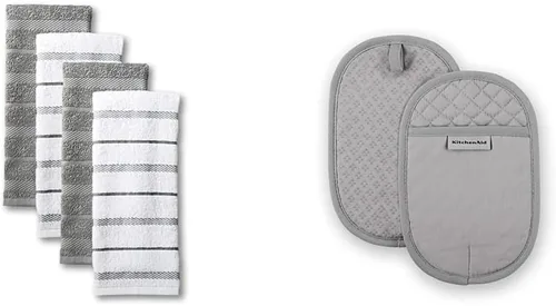 Incluye 2 toallas de cocina de algodón altamente absorbentes de 16 x 26 pulgadas y 2 soportes de algodón resistentes al calor de 6.5 x 10 pulgadas con agarres de silicona (KitchenAid). Los paños de cocina son ideales para limpiar derrames, limpiar y secar platos, mientras que los soportes para ollas protegen las manos de los utensilios de cocina calientes. Los paños de cocina a rayas añaden un acento clásico, y los soportes para ollas cuentan con un lazo para colgar para un almacenamiento cómodo. Fácil de cuidar, lavable a máquina.