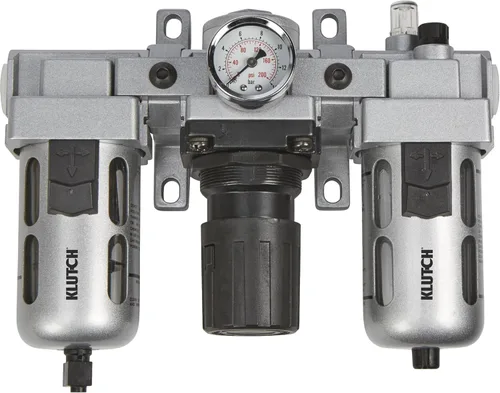 El combo de lubricador regulador de filtro de compresor de aire Klutch cuenta con una construcción modular para facilitar el mantenimiento, ya que cada elemento se puede quitar individualmente. El elemento de filtro de bronce sinterizado de 40 micras se puede limpiar y nunca necesita ser reemplazado. El drenaje nocturno semiautomático asegura que el filtro se drene cuando el compresor está apagado. El lubricador tiene indicador de gota de aceite, controlador de gota de aceite y tapón de llenado de aceite.
