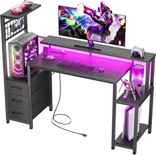 Korfile - Escritorio para juegos de 48 pulgadas con luces LED y tomas de corriente, escritorio para computadora con cajones de tela y gancho