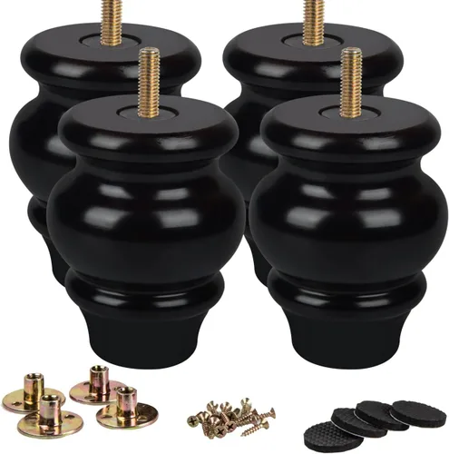 Patas sólidas de los muebles de madera dura con acabado de color negro - Juego de 4 patas de moño de madera maciza con acabado de color para proyectos de muebles de bricolaje, restauración de muebles y proyectos de elevación de altura de muebles. - Tendrás todo listo para conseguir el trabajo. - Perfecto para muebles de sofá, mesa, silla, sofá, cómoda, armarios y mucho más. Fácil instalación - Con este juego completo de patas de muebles de madera, todo lo que necesitas hacer para hacer el trabajo es perforar previamente los agujeros de tornillo M8, fijar las placas de montaje de las patas e instalar patas de madera para muebles. - El diseño elegante y el acabado elaborado por expertos harán que la gente se pregunte si compraste un juego de muebles completamente nuevo. - Fácil instalación y ajuste universal significa que tendrás los muebles mejorados listos para usar en poco tiempo. Especificación - Material: Eucalipto; - Diámetro: 3.0 in. - Altura: 3.5 in. - Rosca de tornillo: 5/16" / M8 (0.315 in); Nota: - 1. Debido a la madera natural, es normal que haya una pequeña desviación en el tamaño, el patrón y el color del artículo, gracias por tu comprensión. - 2. Las patas de madera son de repuesto únicamente, no para manualidades. Debido al material natural, puede que no sea 100% perfecto, no se puede evitar ligeramente imperfecto, por favor entienda; El paquete incluye: - 4 patas de madera para muebles. - 4 placas de hierro. - 1 juego de tornillos.