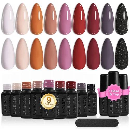 Juego completo de esmaltes de uñas de gel: el juego de esmaltes de gel Lavender Violets incluye 9 colores vibrantes de esmalte de uñas de gel, junto con 1 capa superior, 1 capa superior mate, 1 capa base y 1 imprimación de uñas para una experiencia completa de manicura de gel. Colores festivos de otoño e invierno: nuestro juego de esmaltes de uñas muestra maravillosamente tonos clásicos perfectos para las temporadas de otoño e invierno, con café rico, camello cálido, marrón oscuro y rojo atrevido. Ideal para celebrar Halloween y Navidad, estos colores añaden encanto a tus diseños de uñas. Alta calidad y seguro: fabricado para cumplir con los estándares de calidad de salón, nuestro esmalte de gel está impregnado con resina natural, lo que garantiza una aplicación saludable y agradable para tu experiencia de esmalte de uñas de gel en casa. Fórmula de larga duración: disfruta de uñas resistentes al astillado hasta 28 días con nuestros colores de esmalte de uñas de gel duraderos. La fórmula garantiza que tu manicura se mantenga impecable sin romperse ni pelarse, lo que te permite celebrar las vacaciones de otoño e invierno con confianza. Idea de regalo perfecta: este juego de esmaltes de uñas de gel es ideal para los amantes del arte de uñas y es un regalo versátil para cualquier ocasión. Ya sea para uso diario o celebraciones festivas como Halloween y Navidad, ofrece infinitas posibilidades creativas para diseños de uñas de gel de invierno.