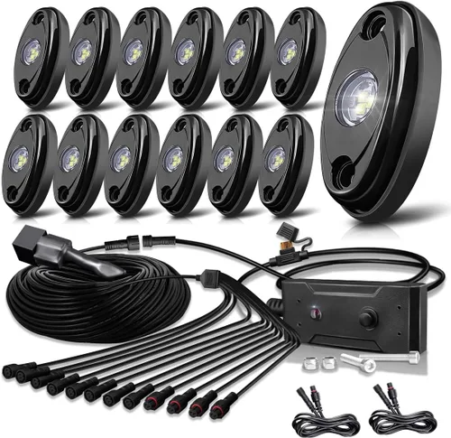 Diseño mejorado y alto rendimiento: kit de luces LED para rocas de color blanco puro con arnés de cableado y interruptor. Cada luz de roca blanca hecha de 3 piezas de tecnología de chips LED XBD SMD 3030; carcasa de aluminio negro fundido y lente de PC reforzada. Resistencias integradas y circuito de protección inteligente de controlador de corriente constante IC regulado más estable. Proporciona más de 540 lúmenes y emite luz blanca de haz de hasta 180 grados de ángulo de visión amplia. Kit de Luces LED de Roca Blancas con Diseño Mejorado—Este kit de luces LED de roca blancas viene con arnés de cable de interruptor; Está diseñado con un ángulo de inclinación de 180° y lente de PC endurecida reforzada para prevenir impactos frontales, reducir la fuerza de impacto, dispersar la fuerza, evitar daños en la lente y puede rebotar de objetos de impacto frontal. Puede ser altamente resistente a impactos fuertes. Excelente diseño para una mejor refrigeración, disipación rápida del calor y hasta 80,000 horas de vida útil. Diseño de mejora de impactos impermeable: la carcasa de aluminio fundido a presión de las luces de roca blancas se llena completamente con una capa de pegamento IP 68 en el cuerpo de la lámpara, que sella el anillo impermeable de goma en la lente frontal. El diseño impermeable IP 68 está especialmente diseñado para la mayoría de las condiciones adversas / escenas prácticas, como: caminos fangosos, lagos pantanosos, pastizales de humedales, etc. Resistente al agua, resistente a golpes, resistente al polvo, resistente a terremotos, resistente al óxido y anticorrosión. Se puede utilizar en cualquier condición, como en lluvia fuerte o entornos hostiles. Amplia aplicación para vehículos—Funciona en todos los DC 9V-36V, excelentes aplicaciones para todoterreno, camión, UTV, ATV, SUV, RZR, RV, coche, 4x4, etc. También se aplica en chasis de arena claro, luces mecánicas de vehículos, luces de cubierta, luces interiores y exteriores, otras luces ambientales de vehículos. Compatible con la mayoría de maquinaria agrícola, faros de excavadoras, luces de montacargas, luces de nieve, vehículos blindados ligeros y otros vehículos con iluminación debajo de la carrocería Fácil de instalar la posición: el kit de arnés de 23.3 pies es suficiente para conectar donde quieras, taladra un agujero para conectar estas luces de roca y utiliza el kit de arnés de cables para conectar todas las luces; luego conecta los cables de electrodo a la alimentación de tu vehículo. El cable de extensión de 5 pies llega fácilmente a la parte trasera de tu vehículo, luces traseras. El paquete incluye 12 luces LED de roca, 12 almohadillas de goma, 2x 12 juegos de tornillos y tuercas, 1 juego de kit de arnés de cables, 2 cables de extensión de 5 pies, 1 manual de instrucciones de instalación.