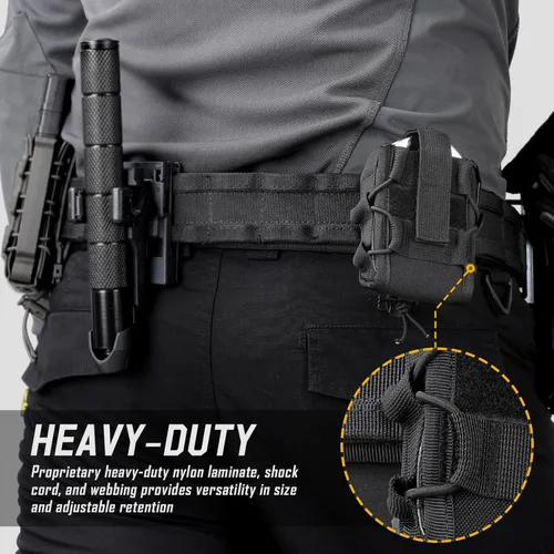RESPUESTA RÁPIDA: El estuche para esposas no solo sostiene de forma segura la mayoría de las esposas con un diseño de correa de retención única, sino que también permite acciones rápidas y decisivas. También puedes quitar la correa interior ajustable de velcro para convertirla en una funda de abertura superior para mayor comodidad y acceso rápido. ESTILO MOLLE CLÁSICO: La funda para esposas está diseñada pensando en los oficiales de la policía. La correa elástica trasera es compatible con el sistema Molle/PALS, varios cinturones tácticos y chalecos en batallas diarias y se ajusta fácilmente a su equipo táctico. Puede montarse en un cinturón de hasta 2"/5 cm de ancho. UNIVERSAL: El portaesposas está diseñado para transportar una amplia variedad de tamaños de esposas, incluyendo esposas encadenadas, esposas con bisagras, esposas rígidas plegables, esposas S&W, y casi todas las demás marcas de esposas. También es ideal para latas de inmersión y otros productos similares. Material resistente: la funda para esposas está hecha de hilo de nailon 100%. Tiene alta resistencia de fibra, alta resistencia a la abrasión y resistencia al desgarro, y es ligero y duradero. Tamaño: 3.54 pulgadas de largo x 2.74 pulgadas de ancho x 3.14 pulgadas de alto, con un peso de 0.14 libras. TENSIÓN AJUSTABLE: La funda para esposas se fija mediante retención de banda elástica para que sea fácil de ajustar en longitud para acomodar varias esposas en diferentes tamaños u otros productos similares, como cargadores y otros artículos para caza al aire libre.