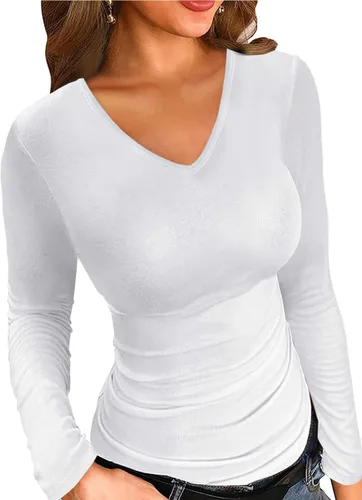 LOLONG Camisetas con cuello en V para mujer, manga cortalarga, casual, acanalada, ajustada