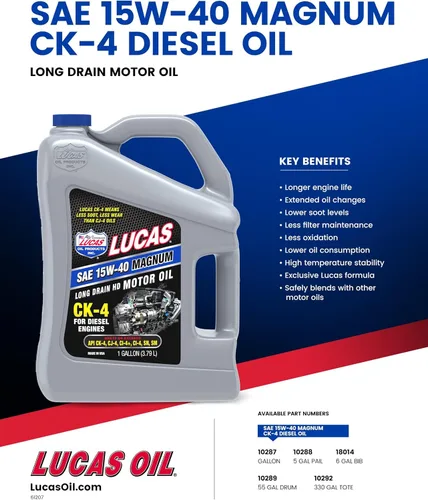 Lucas CK-4 es un aceite de motor resistente premium mezclado con aceites base API Group II y Group Ill de alta calidad y un paquete de aditivos de vanguardia que proporciona el rendimiento robusto requerido por los motores diésel modernos al tiempo que garantiza una buena economía de combustible.
