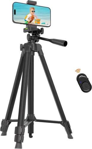 Trípode ligero ajustable: el trípode cuenta con un rango de altura ajustable de 16.5 pulgadas a 53 pulgadas (16.5 - 53.1 in). Diseñado para ser compacto y ligero, pesa solo 1.15 libras (1.1 lbs) y cabe fácilmente en una mochila pequeña. Cabezal de trípode de 3 vías: el trípode cuenta con una cabeza de 3 vías que ofrece una rotación horizontal de 360° y vertical de 90°, lo que te da la flexibilidad para tomas verticales u horizontales. Un nivel de burbuja integrado garantiza un posicionamiento rápido y preciso, por lo que puedes grabar sin esfuerzo los momentos felices de tu vida. Amplia compatibilidad: nuestro soporte para teléfono y control remoto es ampliamente compatible con todos los modelos de iPhone (iPhone 16/15/14, etc.) así como teléfonos Android, incluidos Samsung, Google, OnePlus y más. Equipado con la última tecnología inalámbrica de quinta generación, el alcance efectivo de selfies de hasta 30 pies (32.8 ft) en el viaje nunca ha sido tan fácil. Estable y nota: este trípode para cámara cuenta con una funda de goma antideslizante y está fabricado con aleación de aluminio de alta calidad para mayor estabilidad en varios terrenos. Para mayor robustez, puede colocar un contrapeso al gancho. Sin embargo, evita colocar cámaras de más de 4.6 libras para evitar exceder la capacidad de carga del trípode. 【Lista del paquete】: en el paquete, obtendrás: 1 trípode para cámara, 1 soporte para teléfono, 1 control remoto inalámbrico, 1 bolsa de transporte.