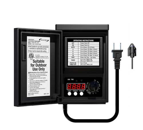 Modos de configuración avanzados: Nuestro transformador horizontal ofrece una gama completa de cinco modos, garantizando una funcionalidad y eficiencia energética sin igual. Incluye (un modo de encendido/apagado manual) (encendido al anochecer, apagado al amanecer) (encendido al anochecer, apagado a las 4/6/8/10 horas) (encendido/apagado a la hora específica que establezcas) (encendido al anochecer, apagado a la hora específica que establezcas), lo que es suficiente para satisfacer cualquiera de tus necesidades y maximizar el ahorro de energía Mecanismos de protección mejorados: Nuestro transformador incorpora protección de circuito integrada para protegerse contra sobrecargas, desconectando automáticamente la fuente de alimentación para evitar daños en el dispositivo y prolongar la vida útil del producto. Además, la función de memoria conserva el modo seleccionado durante los cortes de energía, asegurando un funcionamiento ininterrumpido al reiniciar. Detección sin esfuerzo del atardecer al amanecer: Con un sensor de fotocélula desmontable, nuestro sistema de iluminación de paisajes hace una transición perfecta entre la operación diurna y nocturna. Simplemente configura el botón en modo AUTO, permitiendo que el sensor active las luces al anochecer y las desactive al amanecer, simplificando la configuración y optimizando el uso de energía. Temporizador de Cuenta Regresiva de Precisión: Ofrecendo funcionalidad de temporización controlada por luz, nuestro transformador incluye un temporizador de cuenta regresiva con opciones para períodos de activación de 4, 6, 8 o 10 horas. En este modo, las luces se encienden automáticamente al anochecer y se apagan después de la duración designada, lo que promueve la eficiencia energética y la comodidad. Diseño resistente a la intemperie: construido con materiales plásticos duraderos, impermeables y de alto rendimiento, nuestro transformador está diseñado para soportar diversas condiciones climáticas adversas. Sus propiedades resistentes a la corrosión garantizan longevidad y fiabilidad, por lo que es adecuado para un uso prolongado en exteriores en cualquier entorno. Protección inteligente y pautas de uso: Aunque nuestro transformador puede manejar una carga máxima de 120W, recomendamos usar 90W para obtener los mejores resultados. Esta práctica evita que el sistema funcione a plena capacidad, asegurando una mayor estabilidad y prolongando significativamente la vida útil del producto. Además, el interruptor de reinicio incorporado se activa automáticamente en caso de cortocircuito. Después de la resolución de problemas, una simple pulsación del botón de reinicio hará que su sistema vuelva a funcionar de forma segura.
