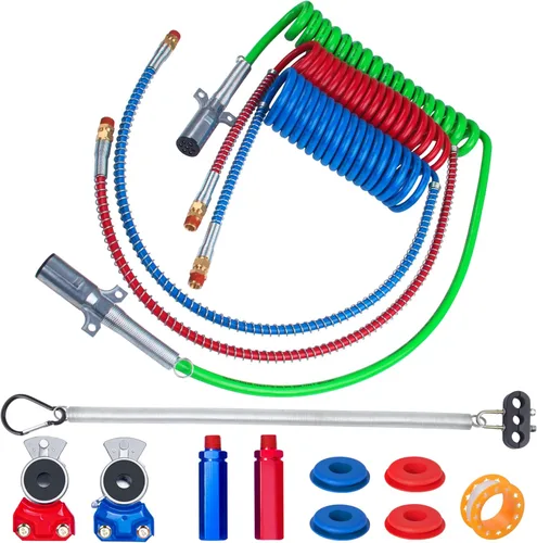 PAQUETE DE VALOR: El kit incluye 1 Par de Mangueras de Freno de Aire Enrolladas de 15 Pies con Conductores de 12" y 40" (Rojo+Azul) + Cable Eléctrico para Remolque ABS de 7 Vías de 15 Pies + Kit de Resorte Tensor + 1 Par de Acoples Rápidos (Rojo+Azul) + 1 Par de Manijas de Extensión Hexagonales (Rojo+Azul) + 4 Sellos de Goma (Rojo+Azul) + 1 Cinta de Teflón. Tenemos accesorios completos y de alta calidad, lo que los hace más fáciles de usar durante más tiempo. Conjuntos de valor por dinero D.O.T. ACCESORIOS DE AIRE: Cumple con SAE J844 y DOT FMVSS 106 y ambas líneas están clasificadas a -65F (-55C). Conexiones confiables y eficientes para un rendimiento de frenado óptimo FRENOS DE AIRE DE ALTA CALIDAD: Nuestras mangueras enrolladas de freno de aire están hechas de material de nailon PA12 de alta calidad, más gruesas y de mejor calidad que otras. Moldeo integrado de 3 capas, mano de obra fina, grosor uniforme, alta presión de estallido. Excelente flexibilidad, buena resistencia química y al desgaste, impermeable, antienvejecimiento. No se endurece ni se vuelve frágil fácilmente en ambientes fríos. El color se mezcla con la materia prima y no se desvanece como la pintura en aerosol Cable de alimentación eléctrica: Los cables de remolque de 7 vías están hechos de cobre puro de alta calidad y tienen una vida útil más larga. Y con excelente conductividad y conductividad térmica para garantizar el uso normal de luces (como señales de giro y luces de freno) durante la conducción REEMPLAZO PARA: La manguera de aire se puede utilizar como reemplazo para Tectran 17215, para Phillips 11-315, para Tremec Sloan 451036N, etc. El cable de alimentación eléctrica se puede utilizar como reemplazo para Philips 30-4621, para Velvac 590161, para PDC EL27715, para Tectran 7ATG522MG, para Tremec 4D015, para Sloan 421130, etc. Nuestras mangueras de aire y cables de alimentación están diseñados y fabricados según