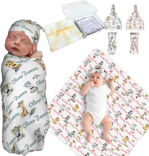 Manta de bebé personalizada con nombre: ¡Descubre el encanto de la personalización! Toque "Personalizar ahora" para diseñar su propia manta personalizada para bebé, completa con un sombrero y/o diadema a juego. Elige entre una encantadora variedad de colores e iconos adorables para adaptar estas mantas para tu pequeño, ya sea una niña o un niño. Manta con nombre de bebé ultrasuave: disfruta de la comodidad de nuestras mantas personalizadas para bebé, hechas de una suave mezcla de poliéster y spandex. Diseñados para la delicada piel de tu bebé, ofrecen un tacto suave como ningún otro. Cada cobija muestra un toque personalizado con el nombre o monograma de tu bebé, asegurando que se convierta en un preciado recuerdo para los años venideros. Regalos personalizados para bebés: Eleva tu juego de regalos con nuestras mantas de arrullo personalizadas: un regalo considerado y único para nuevos padres, baby showers, o cualquier ocasión memorable. Prácticas y preciosas, estas mantas de arrullo seguramente serán atesoradas durante años. Tamaño y artículos incluidos: Ofrecemos 3 juegos, elige los accesorios de acuerdo a tus necesidades. Mantas para envolver de 31.5*31.5 pulgadas (80*80cm) --- es más fácil envolver al bebé, sensación suave y cómoda para que el bebé tenga un sueño perfecto, lo suficientemente generosas para adaptarse a bebés de 0 a 3 meses. 1 manta con un tamaño de 13.5 x 6 pulgadas tiene un dobladillo ajustable, 1 diadema ajustable con un tamaño de 3 x 7 pulgadas Lavable a máquina: ¡Mantenlo simple! Nuestras mantas para bebé personalizadas son lavables a máquina, diseñadas para durar innumerables ciclos para años de comodidad acogedora