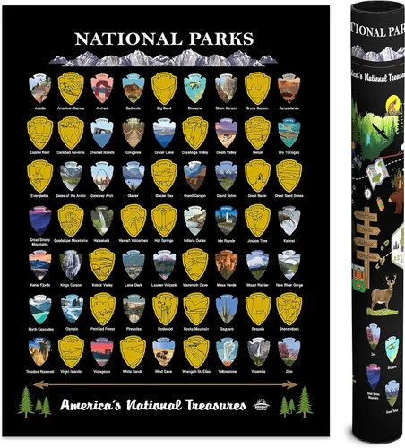 TODOS LOS 63 PARQUES - Incluye todos los parques nacionales de Estados Unidos en un diseño audaz en negro y dorado. Rastrea tus aventuras: rasca para revelar colores vivos mientras visitas cada parque. Impresión prémium: el material grueso y la lámina duradera garantizan un rayado limpio sin desgarros. Fácil de enmarcar: tamaño estándar de 12 x 16 pulgadas que se adapta a la mayoría de los marcos comunes. Kit listo para regalar: se entrega en un tubo decorado con bolígrafo para rascar y paño; perfecto para cumpleaños, vacaciones y viajeros.