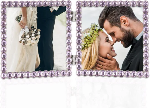 Hermoso diseño: este encantador y dulce marco tiene una fila continua de joyas brillantes engastadas en elegante metal plateado Marco de fotos de metal fundido de alta calidad de alta calidad fabricado con una mano de obra excepcional Elegante y brillante acabado de metal. Realza la decoración de tu hogar con este sofisticado diseño atemporal que complementará cualquier habitación Fácil de abrir. Parte trasera de terciopelo gris de alta calidad y bisagras resistentes para exhibir la mesa Tamaño de la foto Capacidad para dos fotos de 4 x 4 pulgadas