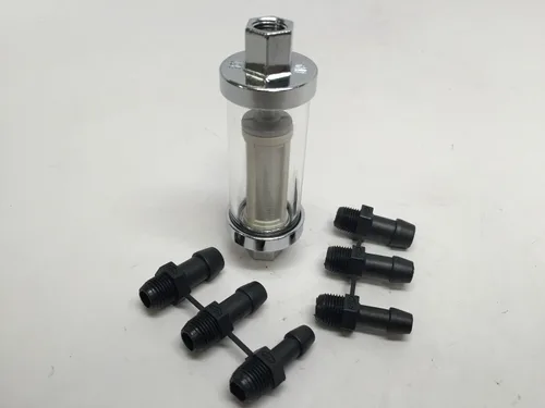 Este es un filtro de combustible universal en línea para líneas de accesorios/diámetro de 1/4", 3/8" y 5/16". El vidrio transparente permite una inspección visual para evitar que los sedimentos de suciedad se almacenen en el elemento de malla blanca reemplazable. Utiliza el elemento de filtro micro 260. Este filtro de combustible de vidrio se adapta a la mayoría de barcos, automóviles, camiones, vehículos recreativos y muchos más. Los letreros IN y OUT están etiquetados en la carcasa. Este juego de filtro de combustible viene con adaptadores/accesorios multiajuste que están hechos de nylon de plástico. Los 3 pares de accesorios son accesorios de 1/4", 5/16" y 3/8" para tamaños de manguera de combustible correspondientes. Dimensión del filtro de combustible: 1-1/8" Diámetro (1" para el vidrio), 3-1/2" (L). También llevamos varias líneas de combustible universales en diferentes tamaños de púas de manguera. ¡No dude en consultarnos para obtener la información detallada sobre estos productos!