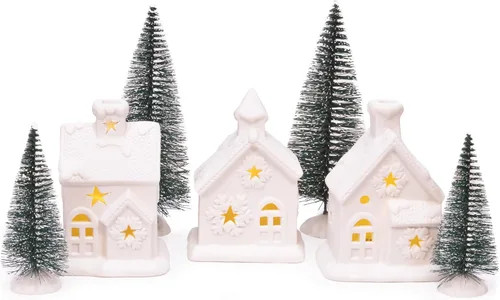 El juego de 7 casas a juego con árboles están hechas de porcelana blanca natural sin esmaltar con una textura única de suéter "tejido" para un diseño acogedor de invierno Cada casa tiene ventanas y estrellas recortadas para que las luces LED integradas en el interior brillen para un hermoso brillo Las casas miden aproximadamente 4 pulgadas de alto, los árboles de cepillo para botellas miden 6 pulgadas de alto (2) y 4 pulgadas de alto (2) La luz segura funciona con pilas que utiliza 2 pilas (LR44) por casa Se envía en un embalaje protector para un fácil almacenamiento durante las temporadas no festivas