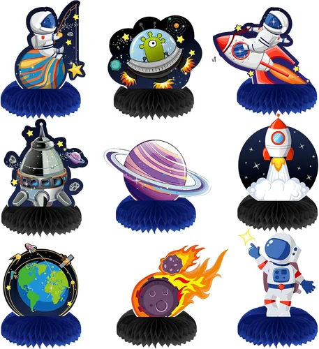 Contenido del paquete: recibirás 9 centros de mesa temáticos de panal para el espacio exterior en diferentes estilos, incluyendo astronauta, nave espacial, cohete, planeta, OVNI, etc. Ahorra tiempo aburrido a tu familia y añade una colorida exhibición a tus decoraciones de mesa de fiesta Diseño adorable: muchos niños sueñan con ser un astronauta para explorar el espacio exterior; puedes aplicar estos adornos de mesa para decorar mesas, mesas de comedor, escritorios, mesas de regalo o alrededor de cupcakes y postres. Las imágenes creativas y novedosas traerán a los niños una increíble fiesta visual Acabado fino: las decoraciones de mesa de doble cara están hechas de papel resistente, resistente y no es fácil de romper, que son confiables de usar y no se deforman fácilmente; adoptando una buena tecnología de impresión, estos centros de mesa de panal cuentan con colores vibrantes y no se decoloran fácilmente, soportando un uso prolongado Fácil de montar: los centros de mesa del espacio exterior son muy fáciles de armar; primero, necesitas encontrar la calcomanía de la bola de panal y arrancarla, luego tirar, girar y pegar al otro lado, repetirlo en el lado opuesto, finalmente puedes ventilar la base; será un momento feliz para montarlos con tu familia Amplio uso: los centros de mesa de papel de panal son adecuados como decoración o accesorios de fotos para fiestas temáticas de cumpleaños, fiestas temáticas del espacio exterior, fiestas temáticas de galaxia, fiestas temáticas del sistema solar, baby showers, festivales, fiestas de disfraces, etc. También serán regalos ideales para aquellos que aman el espacio exterior, cohetes y planetas
