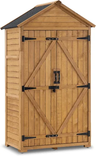 Almacenamiento personalizable con estantes extraíbles: este gabinete de almacenamiento para exteriores cuenta con 2 estantes extraíbles, lo que le permite crear hasta 4 espacios de almacenamiento diferentes; Perfecto para organizar herramientas de jardín, alimentación, productos químicos de piscina y equipos, ofrece flexibilidad para satisfacer sus necesidades específicas de almacenamiento Techo impermeable: el techo de asfalto inclinado está diseñado para ser impermeable, evitando la acumulación de agua y protegiendo sus artículos almacenados; esta característica resistente a la intemperie extiende la vida útil del cobertizo de almacenamiento vertical, manteniendo sus herramientas a salvo de los elementos Estabilidad mejorada con soportes de metal y pies ajustables: equipado con 4 soportes de metal para mayor seguridad, este cobertizo de almacenamiento de patio se mantiene firmemente en su lugar; los 6 pies ajustables garantizan la estabilidad en superficies irregulares, por lo que nunca tendrás que preocuparte por el equilibrio del cobertizo Construcción de madera de abeto: Hecho de madera de abeto, este cobertizo de jardín presenta un acabado rústico y pulido que se mezcla sin esfuerzo con la decoración exterior y el entorno natural Cobertizo grande que ahorra espacio: este cobertizo de madera alto y compacto es ideal para ocultar herramientas de jardín desordenadas sin ocupar demasiado espacio; adecuado para jardines, patios, terrazas, porches o garajes, proporciona un amplio almacenamiento en un espacio compacto; Dimensiones: 35.4 pulgadas de largo x 18.9 pulgadas de ancho x 70 pulgadas de alto Número de cajas: 2