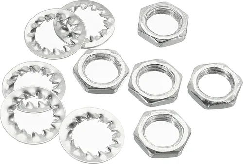 Estas tuercas hexagonales M10 son hardware común para atornillar en el tubo de la lámpara roscado. Y la arandela estándar es para extender la carga de la superficie de los accesorios sujetados. Comúnmente utilizado para asegurar tubos de rosca para montar, reemplazar, reparar candelabros, luces de techo o hacer otros proyectos de lámparas de bricolaje. Tamaño de la rosca: M10x1.0.000 in; Ancho de la tuerca hexagonal: 14mm / 0.55"; Altura de la tuerca hexagonal: 3mm / 0.12"; Tamaño de las arandelas: 10.5mmx17mm / 0.41"x0.67" Hecho de material de hierro, superficie acabada recubierta de zinc, con buena resistencia y resistencia a la corrosión. Las arandelas con dientes pueden agarrar la superficie firmemente al girar las tuercas. Fácil de usar, primero coloca las arandelas a través del tubo roscado, luego atornilla las tuercas en el tubo roscado, sin necesidad de herramientas. Comprueba el tamaño del hilo antes de comprar.